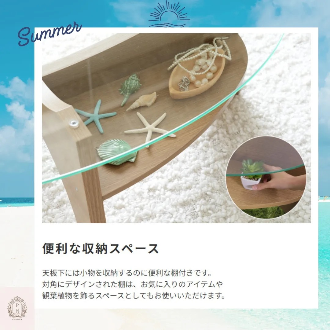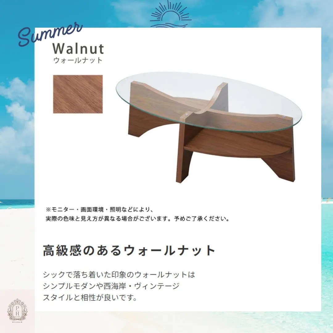 木目調の脚と楕円のガラス天板を組み合わせた斬新なデザインが特徴です。