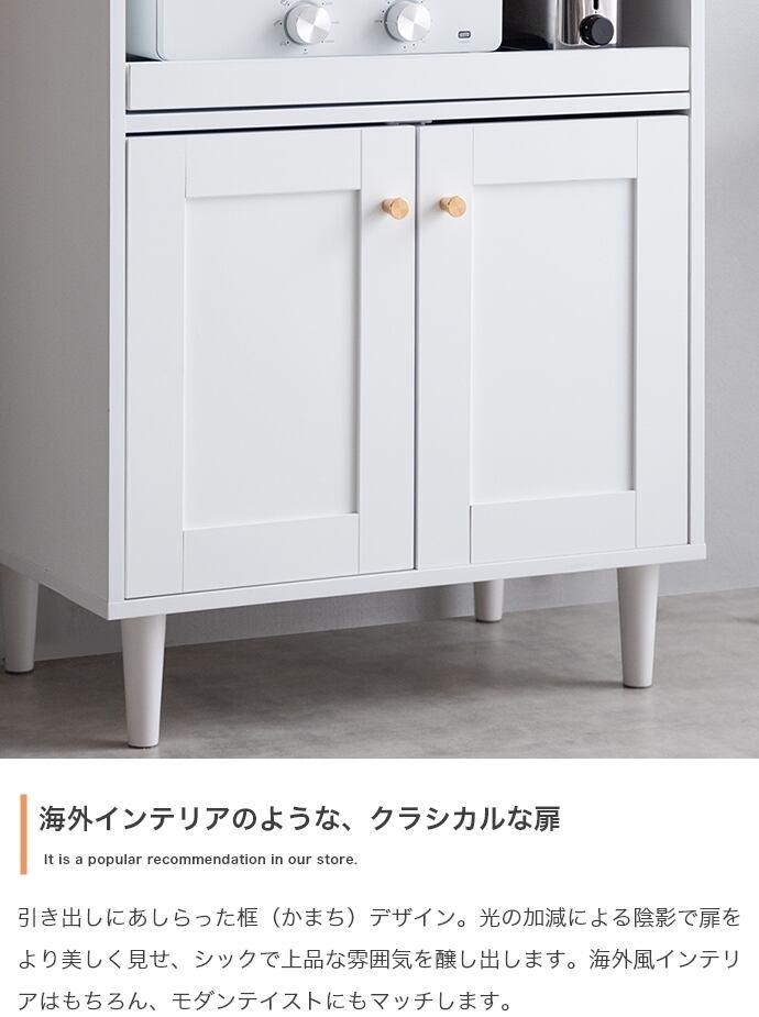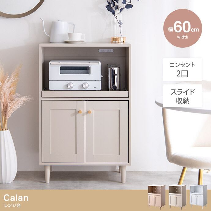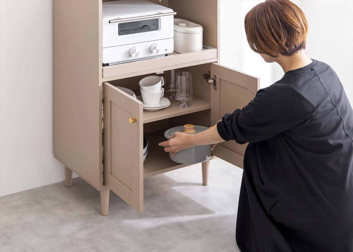 品のある框(かまち)デザインと柔らかなニュアンスカラーが印象的な『Calan(カラン)』シリーズのレンジ台。シャンパンゴールドの取っ手と美しい框デザインはお部屋のアクセントとなり、感度の高い海外インテリアのような空間へと導きます。また、柔らかなニュアンスカラーで甘すぎない大人な可愛さもプラス。