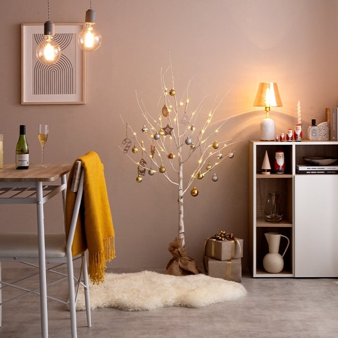 華奢で繊細な枝先に灯るLEDの優しい光とナチュラルな白樺の風合いが魅力的な『Schnee(シュネー)』のブランチツリー。まるで本物の白樺のような美しい木目と凹凸のある質感をリアルに再現しました。シンプルで上品な印象のツリーはワンランク上の落ち着いた大人な空間を演出してくれます。また、オーナメントを外せば、クリスマスシーズンだけでなく、オフシーズンもお部屋のインテリアとして使用できるオールシーズン対応になっています。