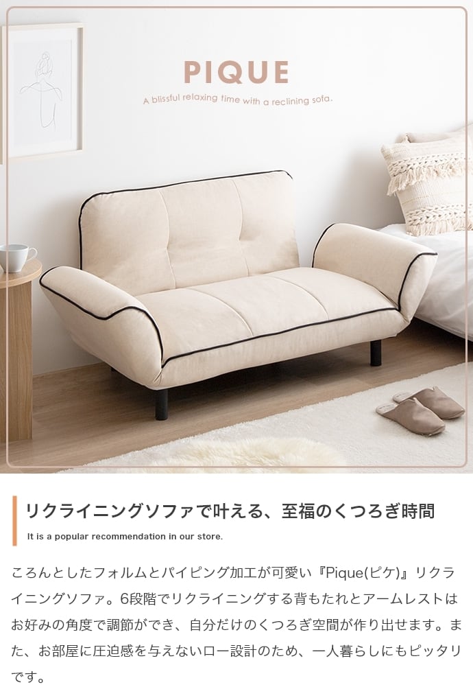 ころんとしたフォルムとパイピング加工が可愛い『Pique(ピケ)』リクライニングソファ。6段階でリクライニングする背もたれとアームレストはお好みの角度で調節ができ、自分だけのくつろぎ空間が作り出せます。バイカラーのパイピングはソファの柔らかな可愛さを引き出し、置くだけでお部屋のアクセントに。また、お部屋に圧迫感を与えないロー設計のため、1人暮らしやワンルームの方にもおすすめです。