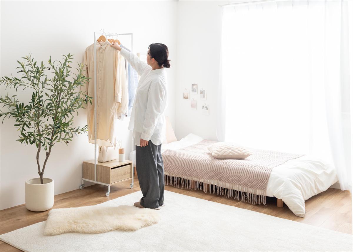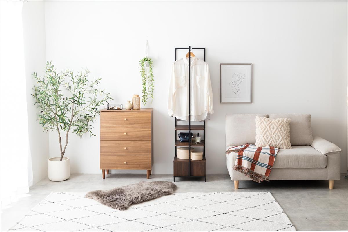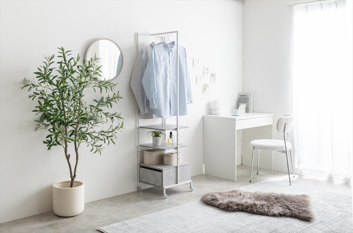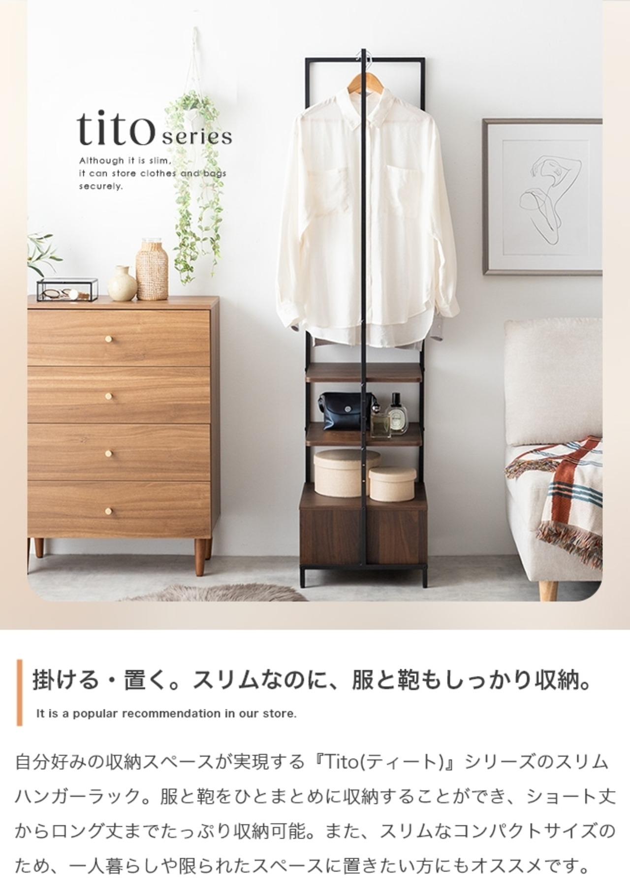 スリムなのに服と鞄をしっかり収納できる『Tito(ティート)』シリーズのハンガーラック。掛けると置くを両立でき、自分好みの収納スペースが実現します。7段階で動く可動棚と引き出し、ハンガーバーは服と鞄をひとまとめに収納することができ、ショート丈からロング丈までたっぷり収納可能。また、スリムなコンパクトサイズのため、一人暮らしや限られたスペースに置きたい方にもおすすめです。