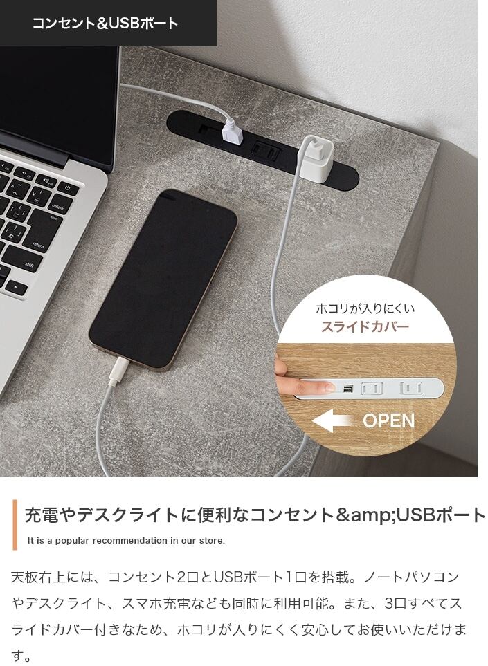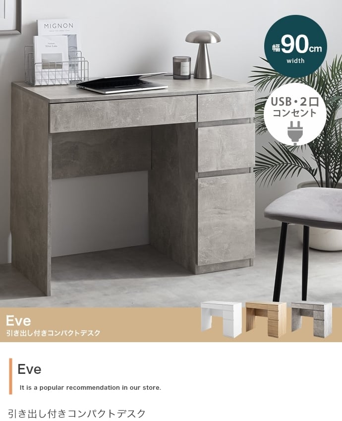 デザインも機能性もスマートにまとまった引き出し付きコンパクトデスク。幅90cmでワンルームにも置きやすいサイズ感ながら、天板はPCや資料も広げやすい広々設計。浅型・深型引き出しで小物やA4ファイルも整理でき、USBポート&2口コンセント付きで充電や卓上家電も同時に使えます。