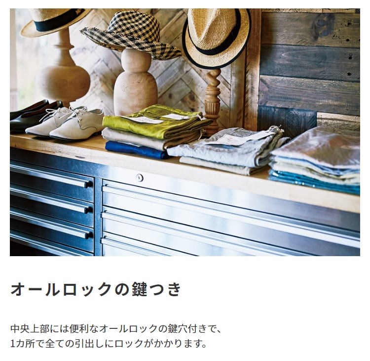 中央上部には便利なオールロックの鍵穴付きで、1カ所で全ての引出しにロックがかかります。