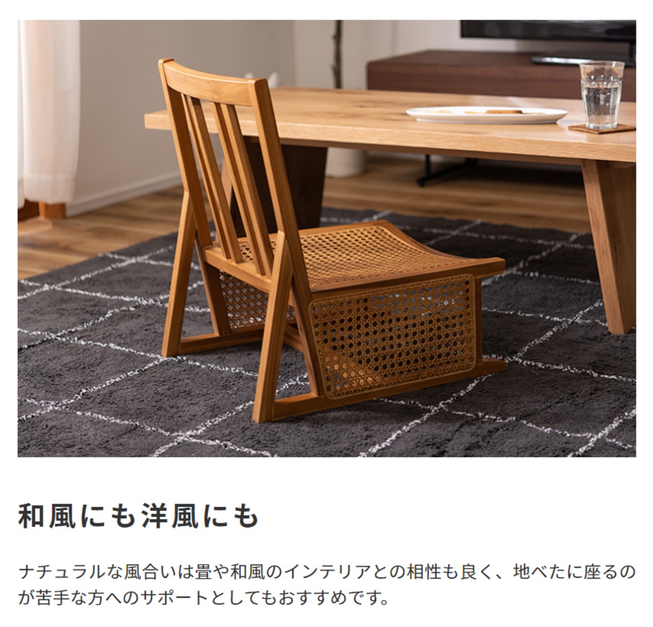 天然木とラタンの風合いが、心地よい空間を演出するフロアチェアです。コンパクトなサイズ感なので、リビングやベッドルーム、書斎など、どんな場所にもしっくりと馴染みます。