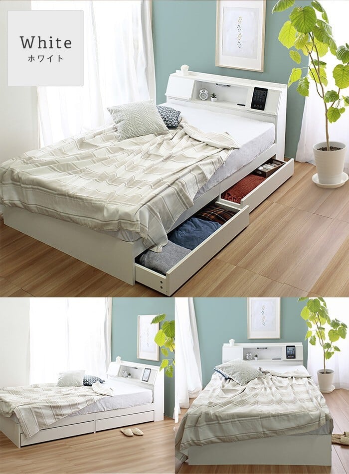 まず、USBポートを搭載しており、ベッドに座ったままスマートフォンやタブレットなどの充電が可能です。さらに、ベッドフレーム内部には収納スペースがあり、パソコンや書類などをスッキリ収納できます。