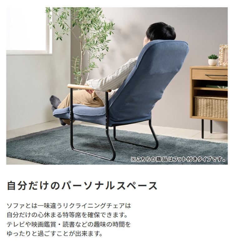 リビング・ダイニング、書斎などお部屋を選ばず溶け込むシンプルなデザインのリクライニングチェアです。