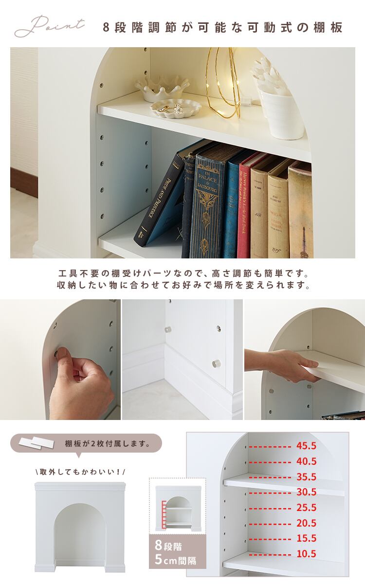 8段階の高さ調節が可能な棚板が2枚付属します。