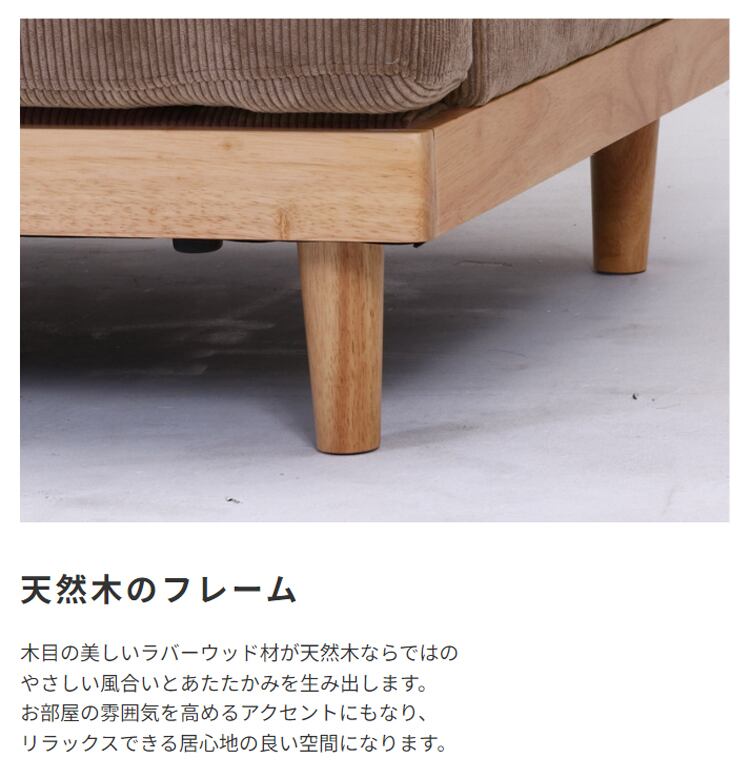 コーデュロイ生地と天然木フレームを組み合わせたソファ